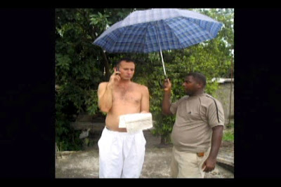 Hay un concurso de performances made in Cuba. Al concurso se presentan varias muy interesantes. Esta es de un «disidente» en libertad condicional (como se llame en Cuba) de raza blanca, que llama por tf a Miami y un sirviente de raza negra le protege del sol, de la lluvia, de las iras de Berta Soler a quien le ha robado un montón de damas de blanco y negro…